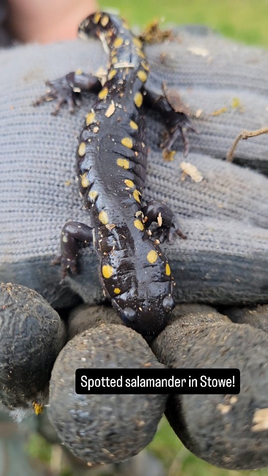 One of the perks of the job interacting with critters! This is spotted salamander was hanging out near a little stream and found a safe, new home just over the opposite bank.